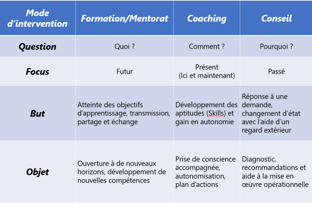 Fort d’une longue expérience de l’accompagnement sous différentes formes, je propose à mes clients une gamme ouverte de méthodes d’intervention, adaptées à leur demande et aux besoins exprimés, dont les grandes lignes sont résumées dans le tableau ci-après.